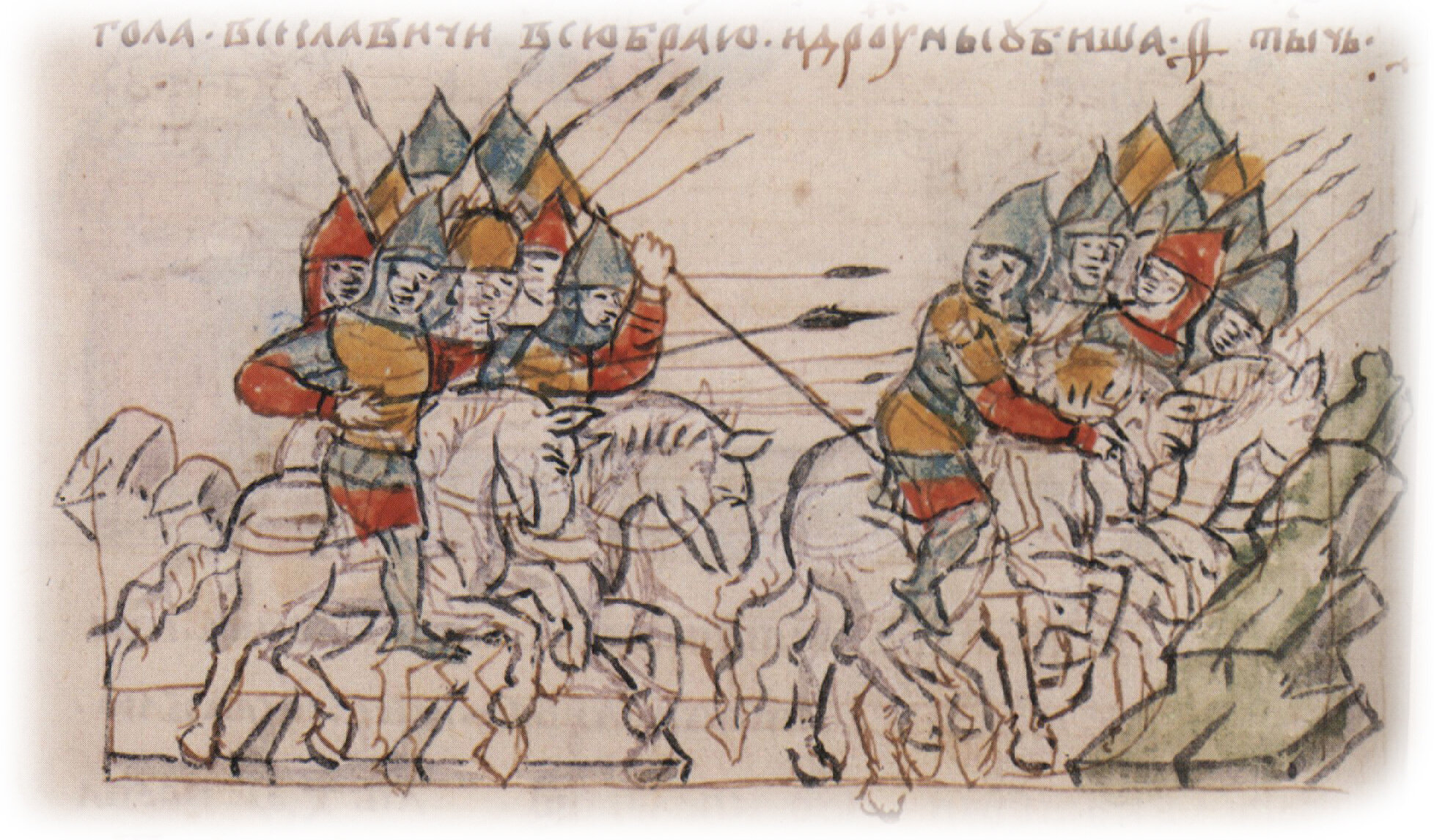 Рисунок "мастера Б" — перо. Правлен (фигуры, лица, шапка, шлемы, копья, лошади, лещадки) "мастера В" — кисть.