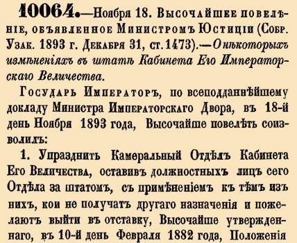 10064. — Ноября 18. высочайшее повеление, объявленное Министром Юстиции, 1892 год.О некоторых изменениях в штате Кабинета Его императорского ВеличестваГосударь Император, по всеподданейшему докладу Министра Императорского Двора, в 18-й день Ноября 1893 года, Высочайше повелеть соизволил:1. Упразднить Камеральный Отдел Кабинета Его Величества, оставив должностных лиц сего Отдела за штатом, с применением к тем из них, кои не получат другого назначения и пожелают выйти в отставку, Высочайше утвержденного, в 10-й день Февраля 1882 года, Положения об обеспечении чиновников Министерства Императорского Двора, оставляемых за штатом.