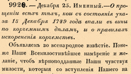 Закон № 9920. 1751 год. 25 декабря (5 января 1752 года). Указ 1751 года об амнистии по корчемным делам и ужесточении правил винокурения.