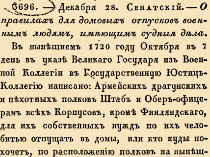 3696. 1720 год. 8 января (28 декабря ст.ст.) Сенатский. О правилах для домовых отпусков военным людям, имеющим судные дела. «В нынешнем 1720 году Октября в 7 день в указе Великаго Государя из Военной Коллегии в Государственную Юстиц-Коллегию написано: Армейских драгунских и пехотных полков Штаб и Обер-офицерам всех корпусов, кроме Финляндского, для их собственных нужд по их челобитью отпущать в домы, или кто куды похочет…»