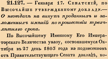 21127. 1804 год. 17 января (29 января). Сенатский, по Высочайше утвержденному докладу. О неотдаче на выкуп проданных и заложенных имений по прошествии трехлетняго срока.