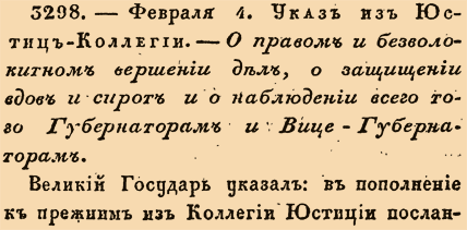 3298. 1719 год. 15 февраля (4 февраля ст.ст.) Указ из Юстиц-Коллегии. О правом и безволокитном вершении дел, о защищении вдов и сирот и о наблюдении всего того Губернаторам и Вице-Губернаторам.Великий Государь указал: в пополнение к прежним из Коллегии Юстиции посланным указам, послать вновь во все Губерния ныне еще указы же, чтобы все надлежащия дела до Коллегии Юстиции, а именно: где есть в которых Губерниях по дачам поместныя и вотчинныя дела, также судныя, сыскныя, розыскныя и по доношениям тамошним Фискальския и разбойничьи и татиныя дела ж <…>