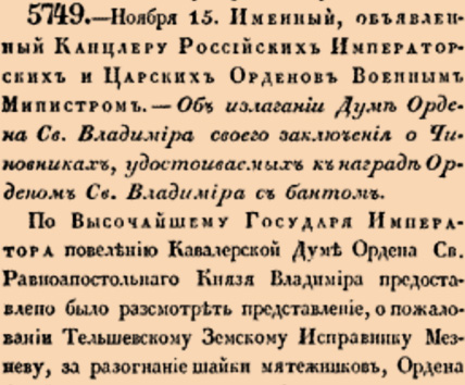 5749. 1832 год. 27 ноября (15 ноября ст.ст.) Именный, объявленный Канцлеру Российских Императорских и Царских Ореднов Военным Министром. Об излагании Думе Ордена Св.Владимира своего заключения о Чиновниках, удостоиваемых к награде Оредном Св.Владимира с бантом. По Высочайшему Государя Императора повелению Кавалерской Думе Ордена Св.Равноапостольнаго Князя Владимира предоставлено было разсмотреть представление, о пожаловании Тельшевскому Земскому Исправнику Мезневу, за разогнание шайки мятежников, Ордена Св.Владимира 4 степени с бантом, вместо полученнаго им за сей подвиг таковаго же Ордена без банта <…>