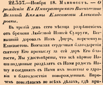 22357. 1806 год. 18 ноября (30 ноября). Манифест. О рождении Ея Императорскаго Высочества Великой Княжны Елисаветы Александровны.
