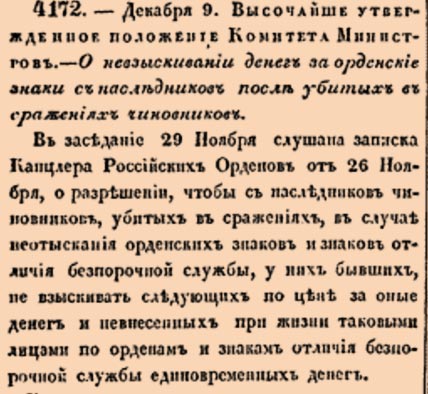 4172. 1830 год. 9 декабря (21 декабря). Высочайше утвержденное положение Комитета Министров. О невзыскивании денег за орденские знаки с наследников после убитых в сражениях чиновников.