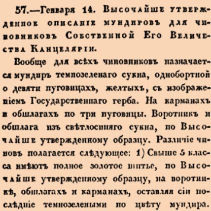 57. 1826 год. 26 января (14 января ст.ст.) Высочайше утвержденное описание мундиров для чиновников Собственной Его Величества Канцелярии. Вообще для всех чиновников назначается мундир темнозеленаго сукна, однобортной о девяти пуговицах, желтых, с изображением Государственнаго герба. На карманах и обшлагах по три пуговицы <…>