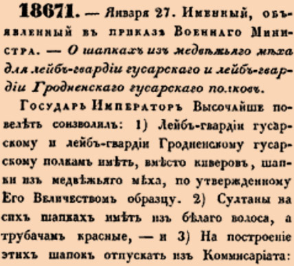 Закон № 18671. 1845 год. 27 января (8 февраля). Указ об утверждении шапок из медвежьего меха взамен киверов для лейб-гвардии Гусарского и лейб-гвардии Гродненского гусарского полков с определением порядка их изготовления и финансирования.