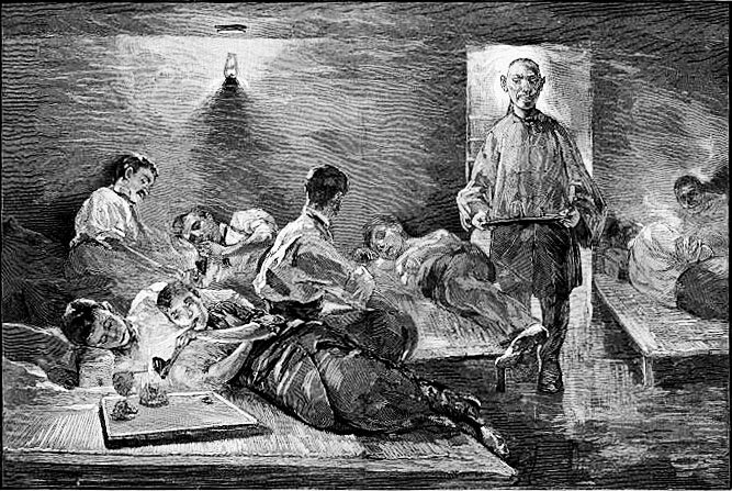 Американские курильщики опиума — интерьер опиумного притона в Нью-Йорке