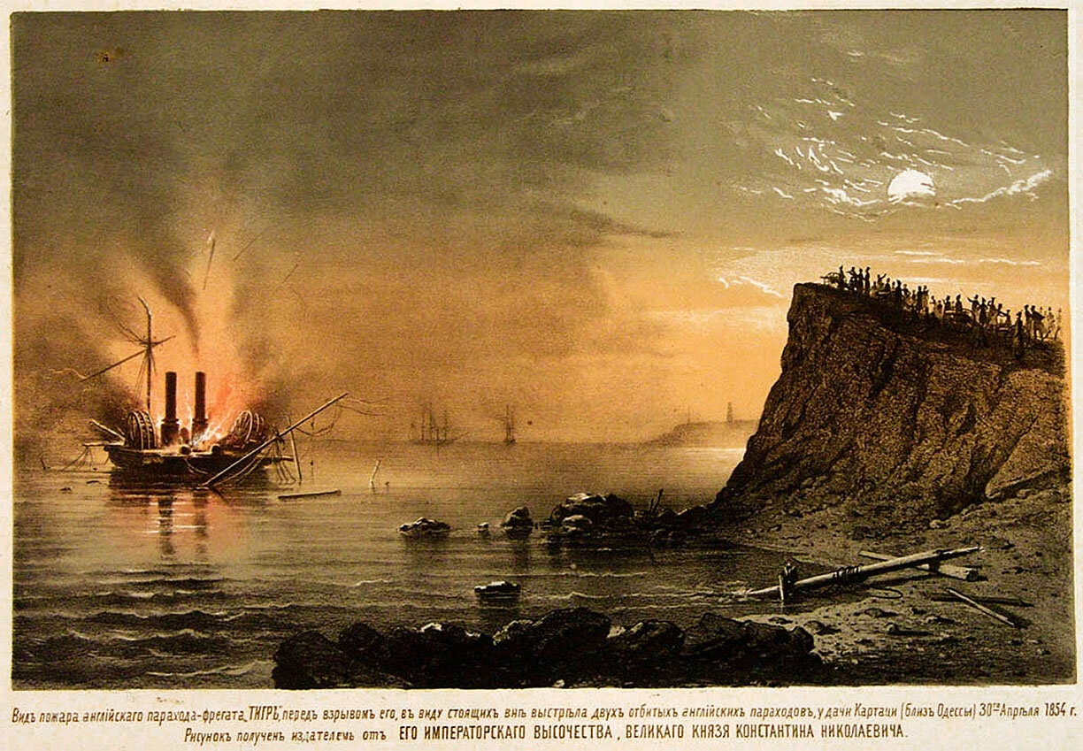 Вид пожара английского парохода-фрегата "Тигр", перед взрывом его, в виду стоящих вне выстрела двух отбитых английских пароходов, у дачи Картаци (близ Одессы) 30 апреля 1854 года