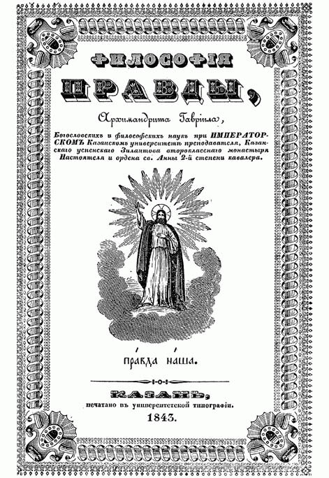 Титульный лист издания: Гавриил, архимандрит (Василий Николаевич Воскресенский). Философия правды. — Казань, 1843.