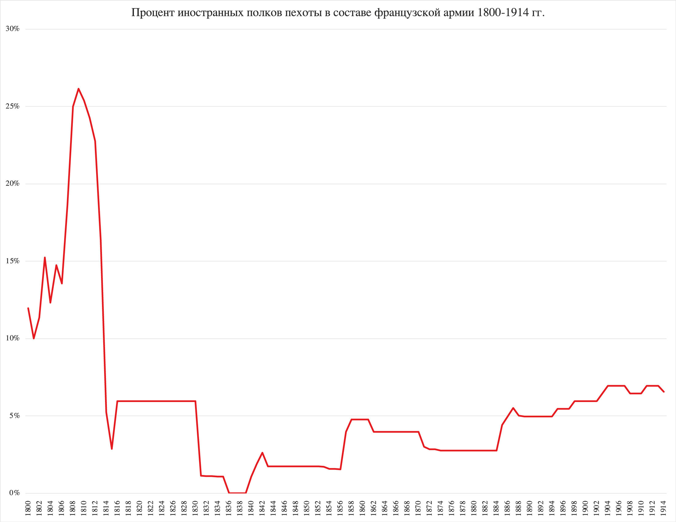 Процент иностранных полков пехоты в составе французской армии 1800-1914 гг.