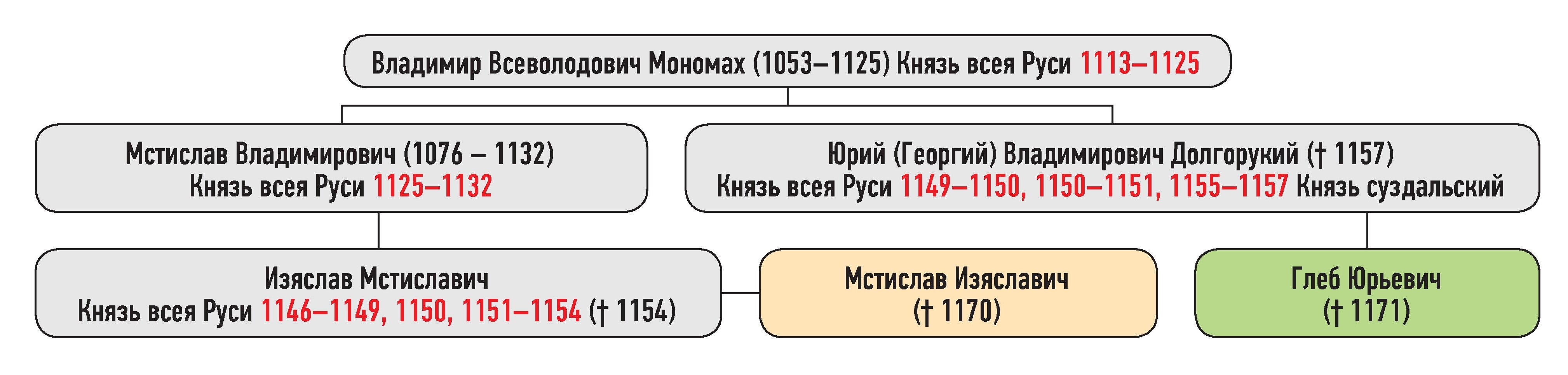 Изяслав, Ростислав Мстиславичи — сыновья Мстислава Владимировича, Ярослав Изяславич — сын Изяслава Мстиславича, Юрий Владимирович — сын Владимира Всеволодовича Мономаха