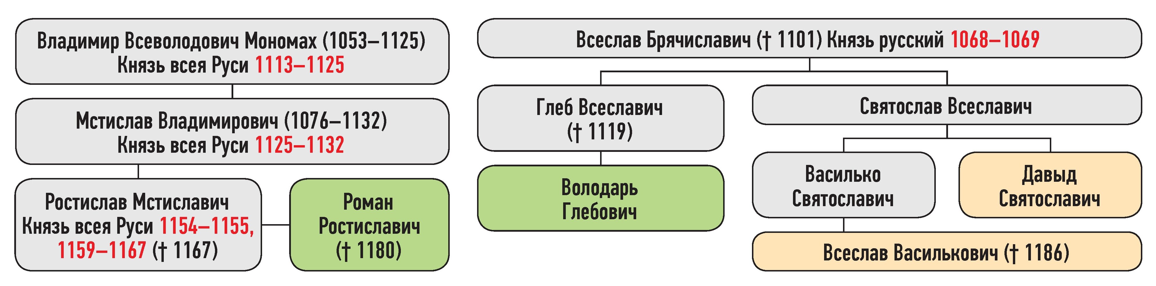 Володарь Глебович — сын Глеба Всеславича, Всеслав Василькович — сын Василька Святославича, Давид Святославич — сын Святослава Всеславича, Роман Ростиславич — сын Ростислава Мстиславича