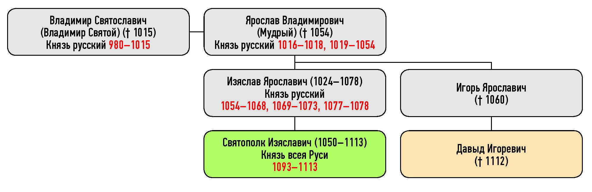 Владимир Святославич (Владимир Святой) († 1015) Князь русский, Святополк Изяславич (1050–1113) Князь всея Руси, Изяслав Ярославич (1024–1078) Князь русский, Ярослав Владимирович (Мудрый) († 1054) Князь русский, Игорь Ярославич († 1060), Давыд Игоревич († 1112)