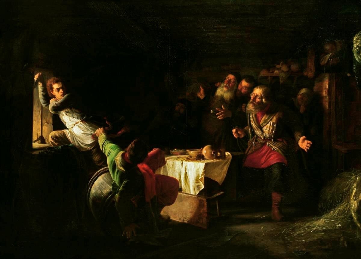 Сцена из трагедии А.С. Пушкина «Борис Годунов» (1825 ) — «Корчма на литовской границе»<br>