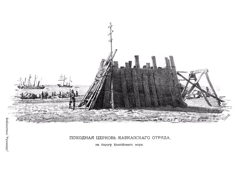 Походная церковь Кавказского отряда на берегу Каспийского моря.