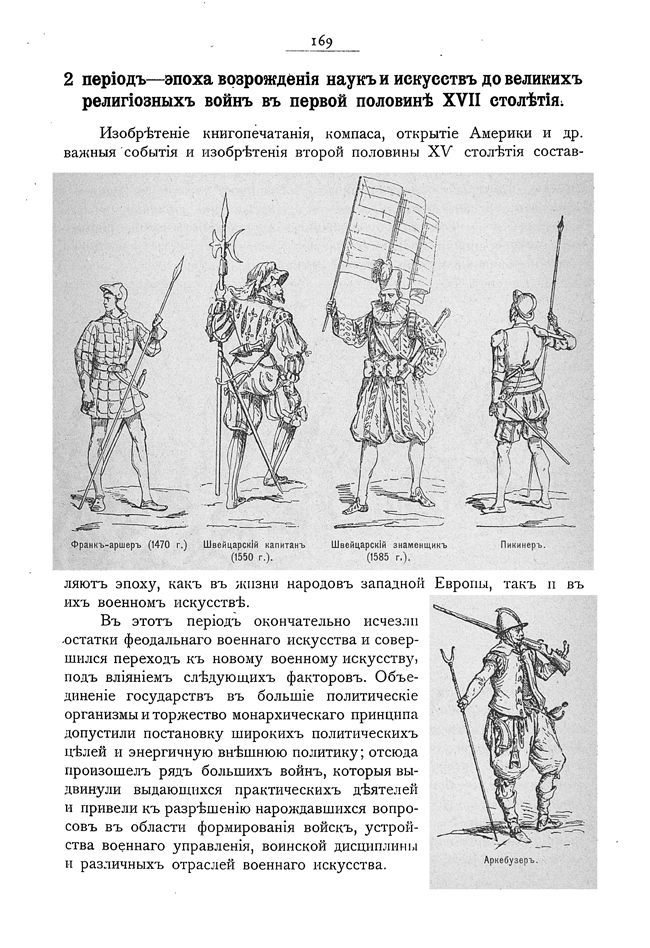 Франк-аршер (1470). Швейцарский капитан (1550). Швейцарский знаменщик (1585). Пикинер. Аркебузер.