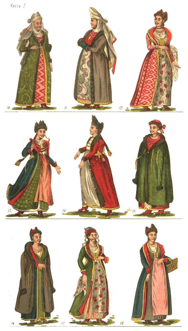 Изображение малороссиян в старинных одеждах: 10) малороссийская госпожа в старинном наряде; 11) она же в другом наряде; 12) шляхетная госпожа в летней одежде; 13 и 14) пляшущие малороссийские госпожи; 15 и 16) шляхетные госпожи в в зимнем наряде; 17) шлях