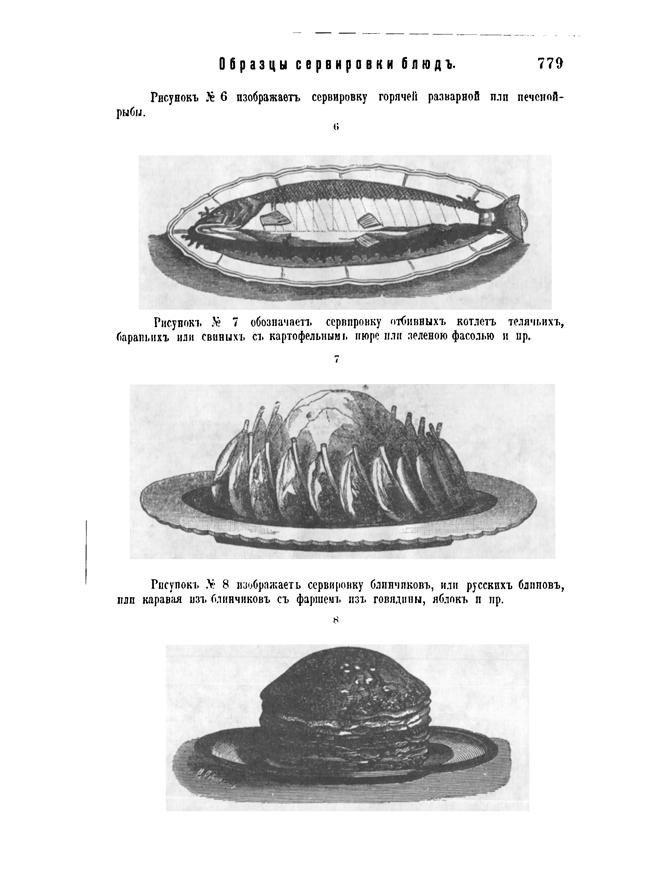 Образцы сервировки блюд. Рисунок №6. Сервировка горячей разварной или печеной рыбы. Рисунок №7. Сервировка отбивных котлет телячьих, бараньих или свиных с картофельным пюре или зеленой фасолью. Рисунок №8. Сервировка блинчиков или русских блинов, или ка