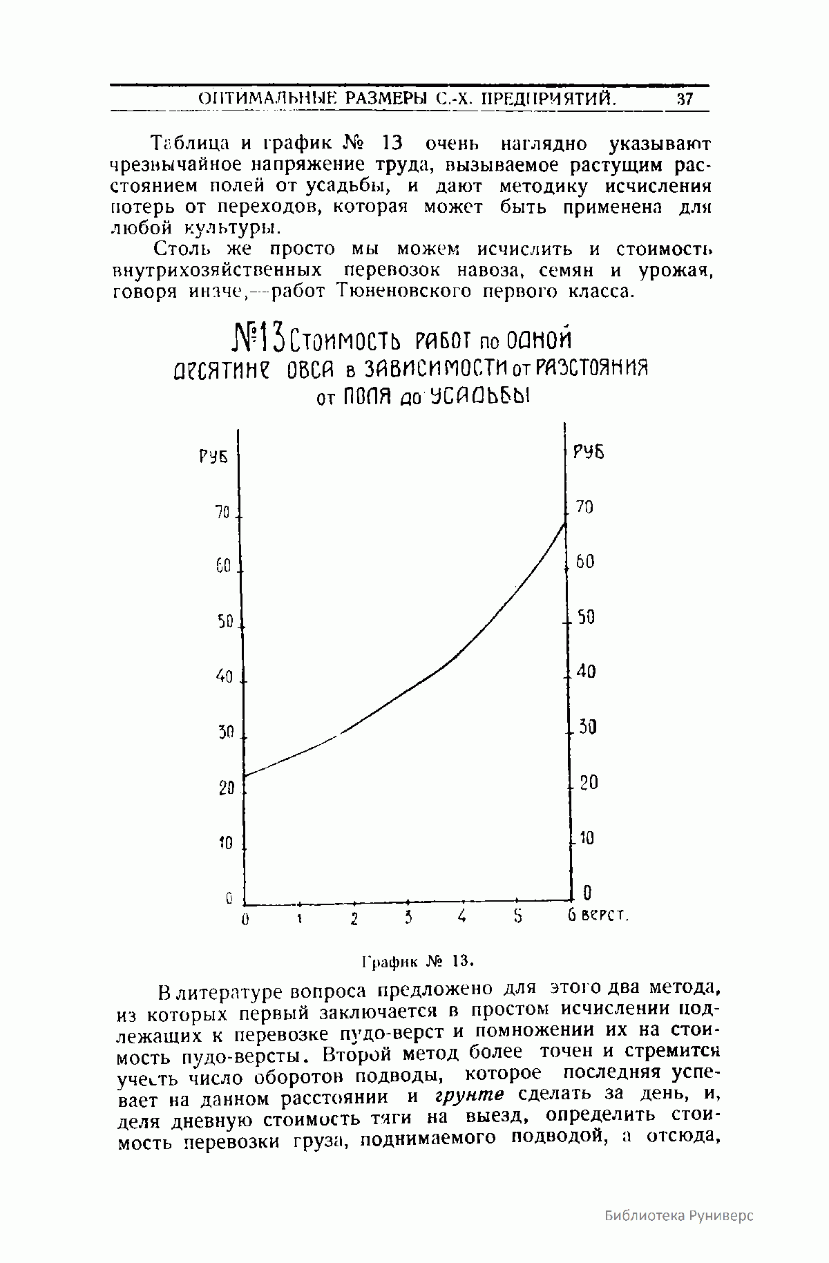 График №13. Стоимость работ по одной десятине овса в зависимости от расстояния от поля до усадьбы.