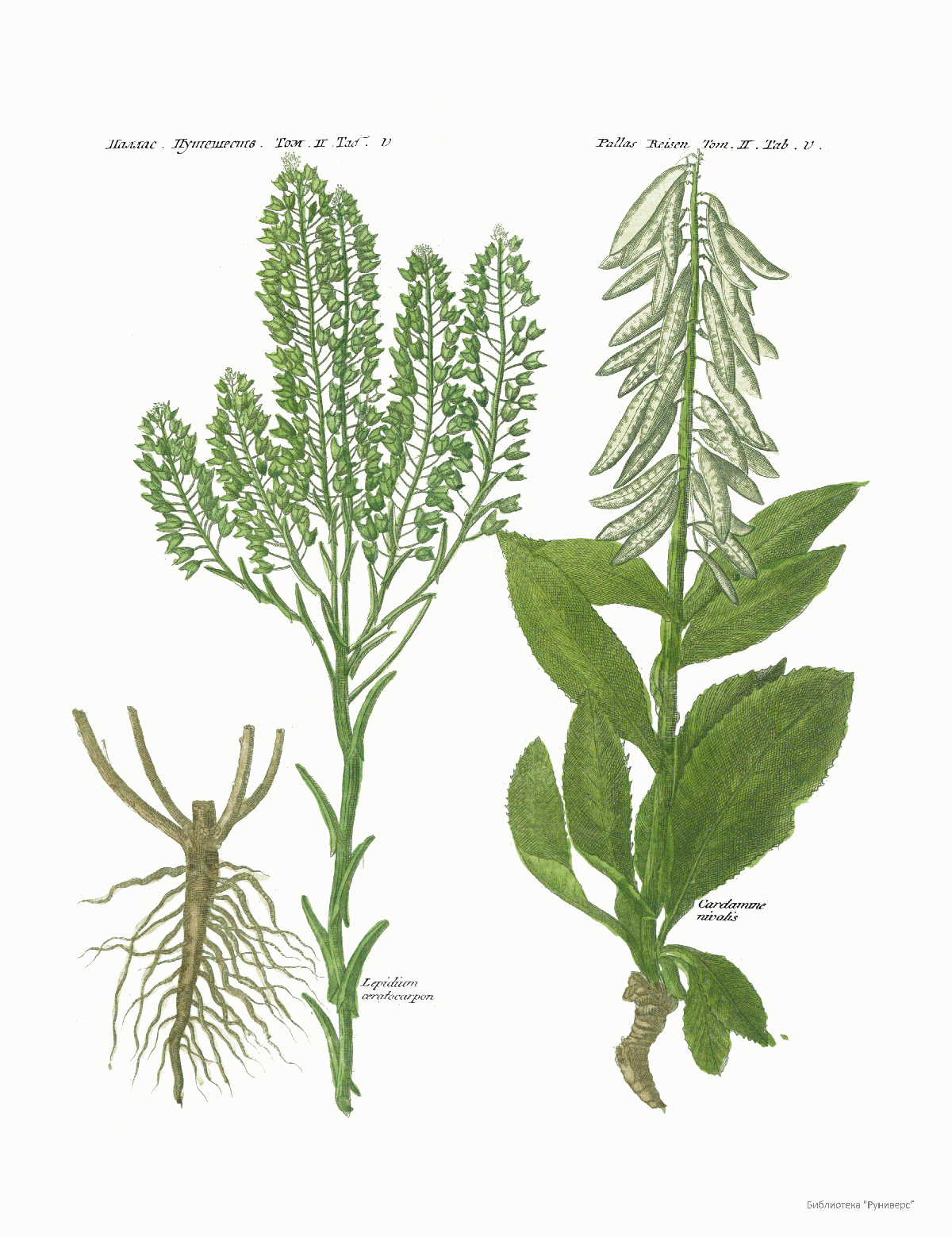 Том II. Таб.U. Lepidium ceratocarpon. Cardamine nivalis.