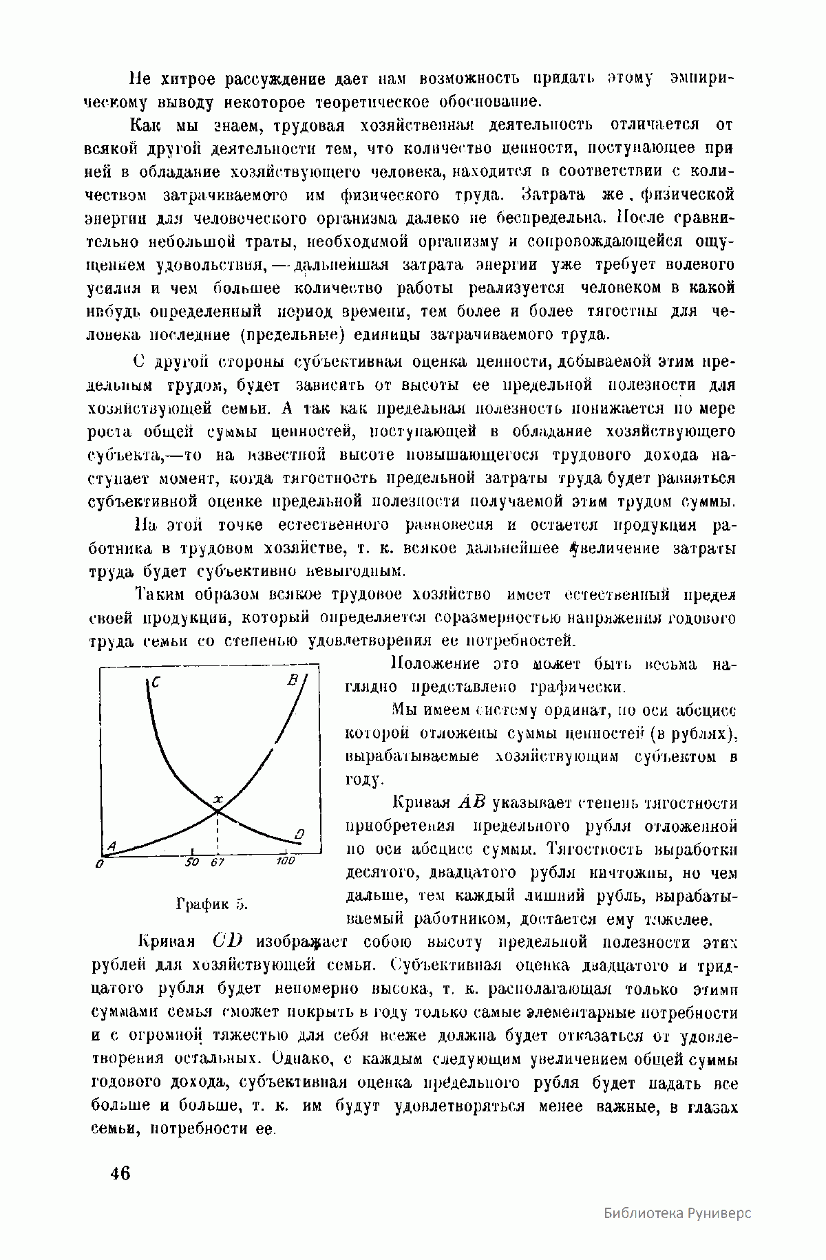 График 5. Соотношение тягостности затраты годового труда семьи (кривая AB)и полезности получаемой этим трудом суммы (кривая CD).