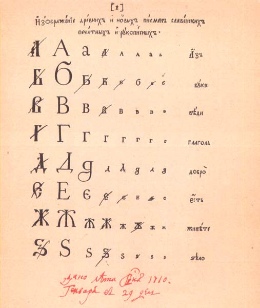 Образец гражданской азбуки, исправленный Петром I. 1710год