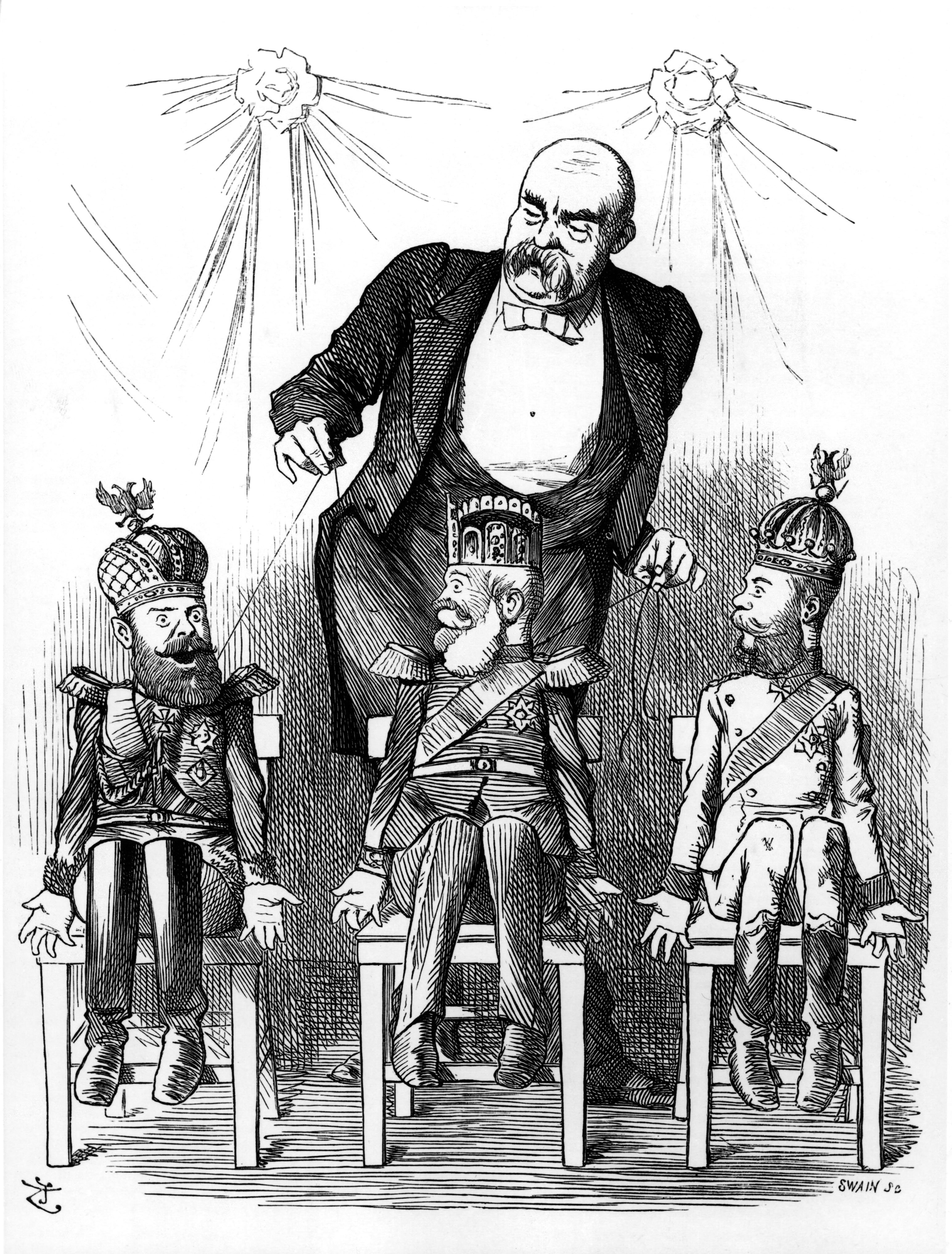 Карикатура из журнала "Панч". Бисмарк манипулирует Россией, Австрией и Германией. 1884 год