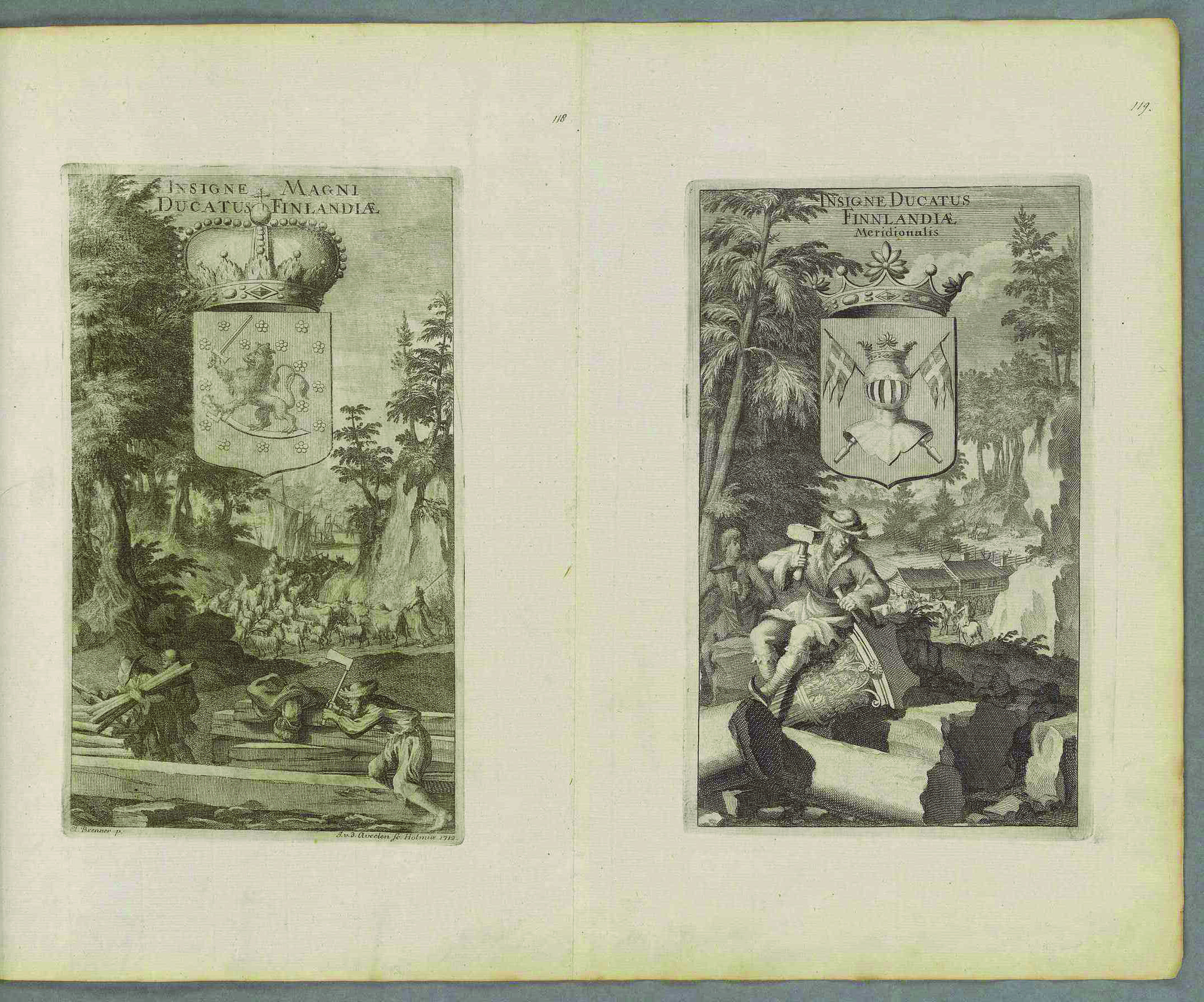 Гербы великого княжества Финляндии и трех княжеств Финляндии: Южная Финляндия (Finтlandia Meridionalis), Северная Финляндия (Finтlandia Septentrionalis) и Карелия