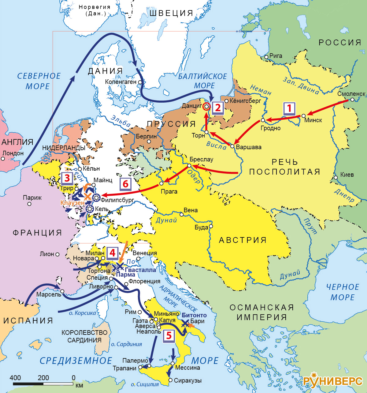 Полки Англии, Испании, Франции, Швеции, Австрии, Баварии, Саксонии, Пруссии