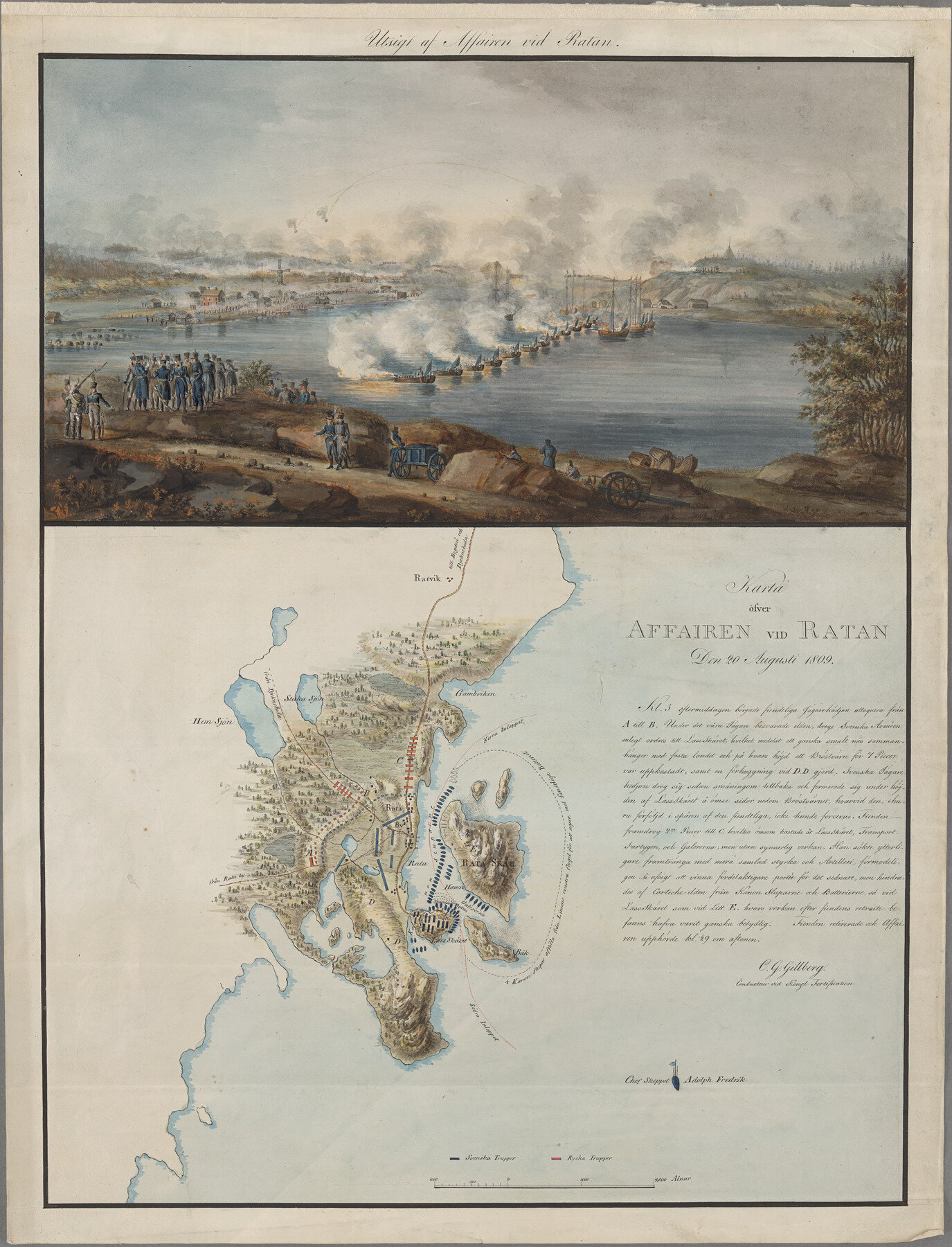 На этой акварели, принадлежащей кисти шведского художника и чертежника Карла Густава Гилберга (1774–1855 гг.), показано сражение при Ратане, состоявшееся 20 августа 1809 года между шведскими и российскими войсками. Одновременно с наполеоновскими войнами в начале XIX века имела место война между Швецией и Россией, получившая название Финской войны, итогом которой стало радикальное изменение политической карты Балтийского региона. Поражение Швеции положило конец ее господству в регионе. Финляндия, бывшая шведской провинцией, приобрела статус великого княжества под властью царя России. Потеря Финляндии кардинально изменила самовосприятие Швеции. Утратив статус региональной державы, она нашла свое новое призвание не в притязании на имперское величие, а на пути избежания военных конфликтов и видоизменения внутренней социальной модели. В шведской историографии сражение при Ратане воспринимается как символ этих перемен. Для Финляндии же итоги этого сражения означали политическое преобразование, приведшее к новому политическому самосознанию и активизации зарождающегося финского национализма.