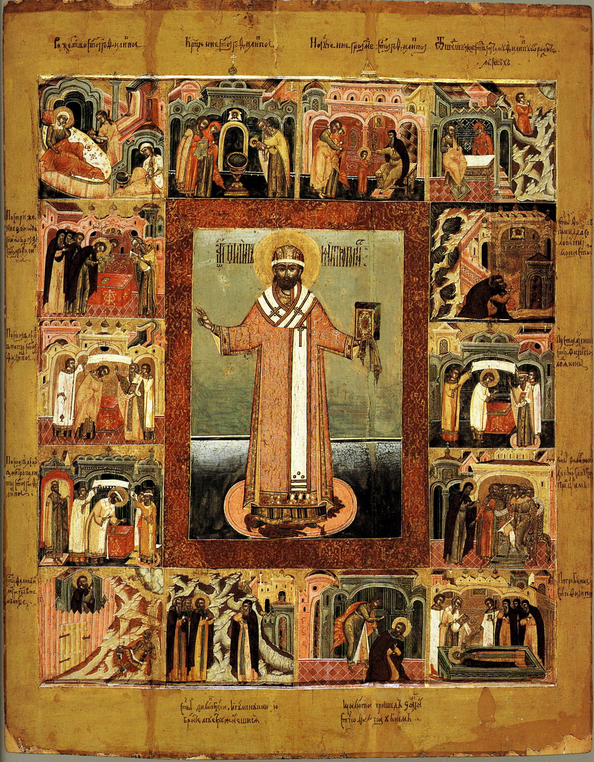 Порядок клейм: 1. Рождение Федора (мирское имя митрополита Филиппа ) 2. Крещение Федора 3. Научение грамоте 4. Федор покидает родительский дом 5. Приход в Соловецкую обитель 6. Пострижение в иноческий чин 7. Рукоположение в диаконы 8. Рукоположение в пресвитеры 9. Поставление в митрополиты 10. Свт. Филипп обличает царя Иоанна Грозного 11. Заточение в темницу 12. Свт. Филипп перед игуменом Тверского Отроча монастыря Протасием 13. Убиение свт. Филиппа 14. Погребение свт. Филиппа