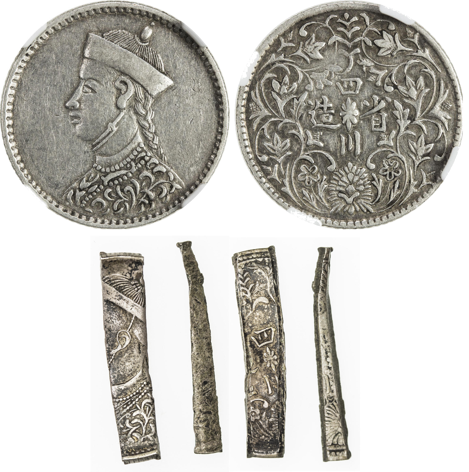 Сверху: ¼ т.н. сычуаньской торговой рупии (四川盧比, также известна под названиями 藏洋, 藏元, 川卡, 藏幣 и 洋錢)). В начале XX в. рынки Тибета, Юннани и Сычуани были переполнены индийскими рупиями и другими иностранными монетами. Генерал-губернатор провинции Сычуань Си Лян (錫良) и его помощник Чжао Эрфэн (趙爾豐) поручили монетному двору выпустить новый тип серебряной монеты, которая была бы подобна индийской рупии, для вытеснения иностранной валюты из региона. В 1905 г. было отчеканено 3 монеты: 1 рупия (31 мм, 11,2-13,6 гр, 900 проба ), ½ (24мм, 5,7-6 гр,860 проба) и ¼ рупии (19мм, 2,8-3,4 гр, 820 проба). На аверсе портрет императора Гуан Сюя в стиле королевы Виктории - самое раннее изображение правителя на монетах Китая. Чеканка с постепенной порчей (сначала до 700 пробы, потом 500, в 1940-е содержание серебра упало до смешных 10%) продолжалась до 1944 г., сами монеты ходили в Тибете до 1958 г. Редкая, продана за 850 долларов.