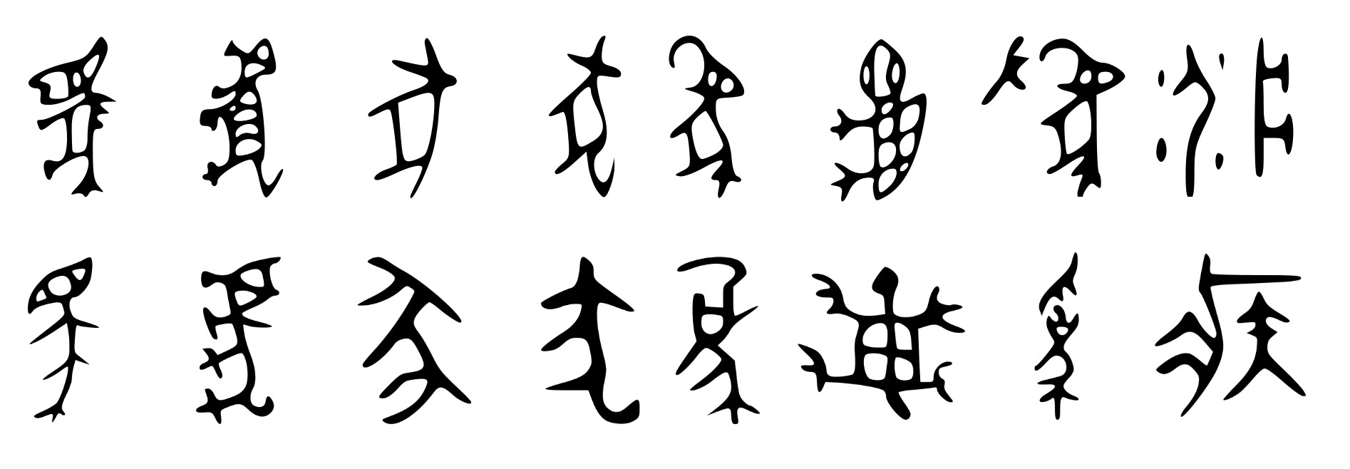 Слева направо: 馬(mǎ, лошадь), 虎 (hǔ, тигр), 豕 (shĭ, боров), 犬 (quǎn, пес), 象 (xiáng, слон), 龜 (guī, черепаха), 為 (wèi, руководить), 疾 (jí, болезнь). Обратите внимание на сложность последних символов, выражающих достаточно абстрактные понятия.