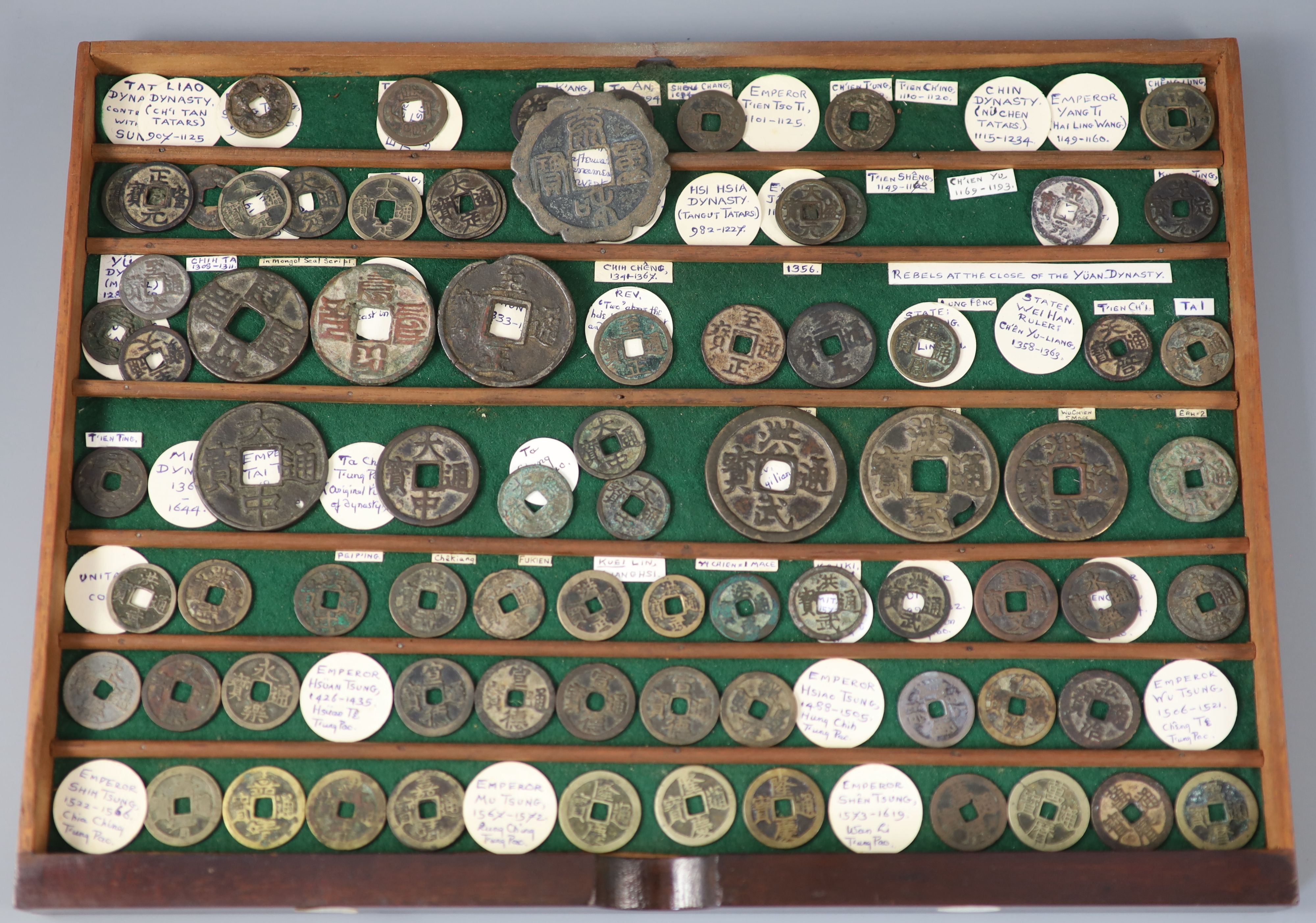 В завершение - совершенно удивительный лот, проданный в итоге за 3500 фунтов стерлингов в 2021 году на британском аукционе Gorringe's. 77 монет с 907 по 1619 год, среди них и те, о которых шла речь в статье и те, что будут далее (вообще львиная доля здесьэто Мин, затем Юань и еще немного всяких тангутов, Сун и прочего). Этот ящик принадлежал Альфреду Арбер-Куку (Alfred Theodore Arber-Cooke, 1905-1993), антиквару и заядлому коллекционеру азиатских произведений искусства и монет, в основном собиравших с 1930-х по 1970-е годы. Он собрал хорошую справочную библиотеку по китайским и азиатским монетам и несколько раз (1969-70) писал академику Ф. А. Тюрку по поводу изучения монет-амулетов. Он жил в Уимблдоне, Большой Лондон, и был связан с Археологическим обществом Суррея. Позже он переехал в Лландовери в Кармартеншире, Уэльс, снова занялся местной археологией и написал «Историю Лландовери», опубликованную в 1975 году. Поразительно то, что если все монеты, представленные здесь, подлинные - то стоимость нескольких из них зашкаливает за полмиллиона долларов. Естественно, скорее всего они являются более поздними копиями, причем об этом предупреждал и сам аукцион, продавая лот, как есть. Тем не менее, покупка такого набора - отличный способ вкатится в китайскую нумизматику, тем более на Западе подобные находки всплывают крайне редко.