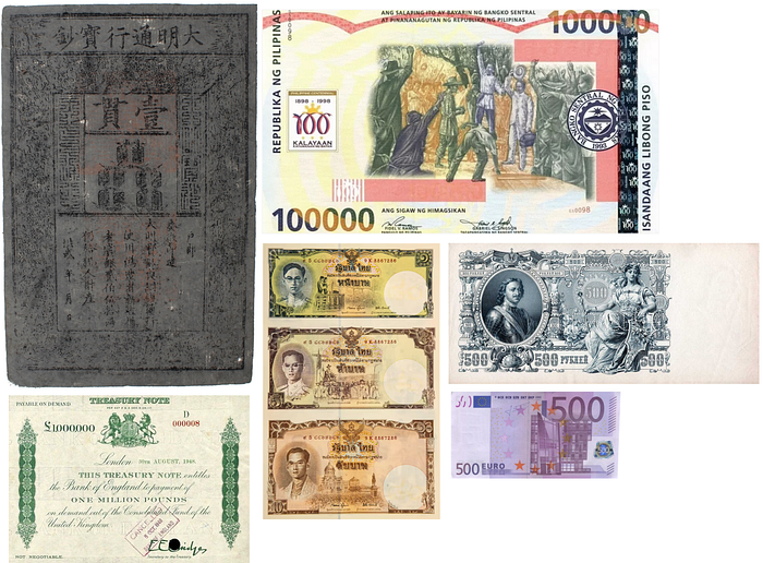 Сравнительное изображение общепринято крупных банкнот. Минская простыня больше чем лист А4! Три тайские банкноты напечатаны неразрезанными на одном листе и считаются за одну.