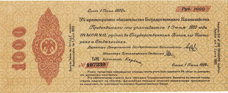 5% Краткосрочное обязательство Государственного Казначейства Российского правительства адмирала А.В. Колчака. 1000 руб. Срок 1 июня 1920 г.