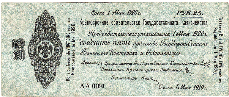 Краткосрочное обязательство Государственного Казначейства Российского правительства адмирала А.В. Колчака. 25 руб. Срок 1 мая 1920 г. Аверс