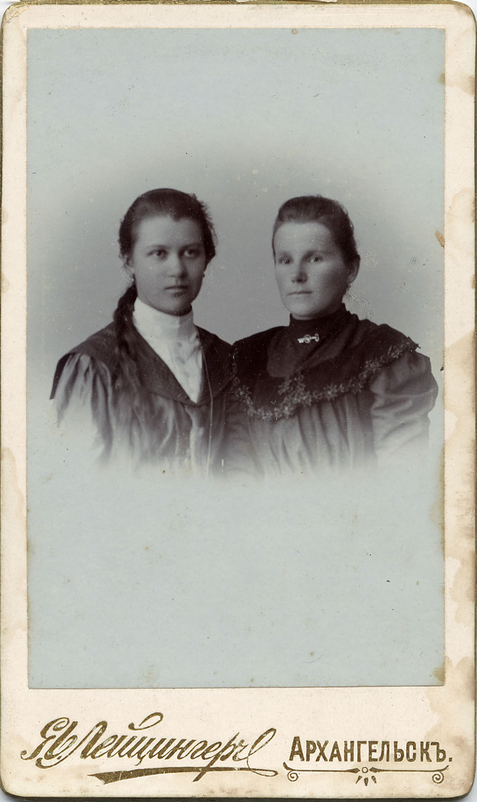 Фотограф Я. Лейцингер, Архангельск. Портрет двух женщин. На обороте надпись: “На память Александре Ивановне от Мани Подряшениковой. 1902 г.”.