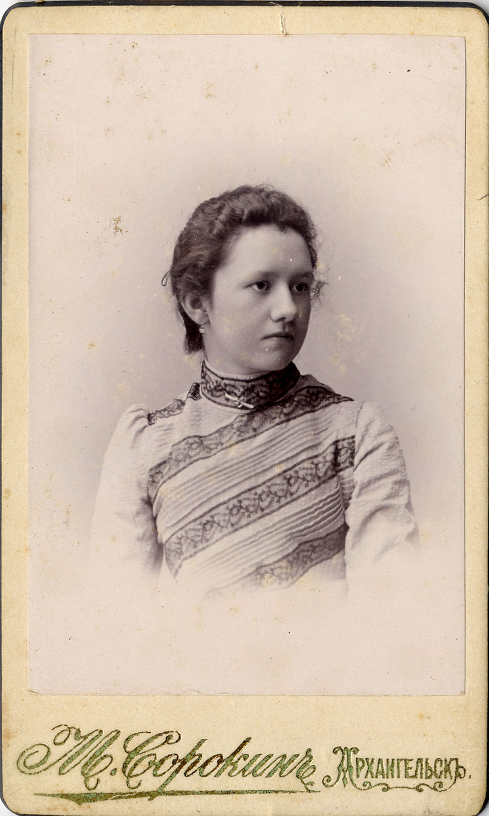 Фотограф М. Сорокин, Архангельск. Портрет молодой девушки. На обороте надпись: “На память дорогой тете от Юли”. 1900-е г.