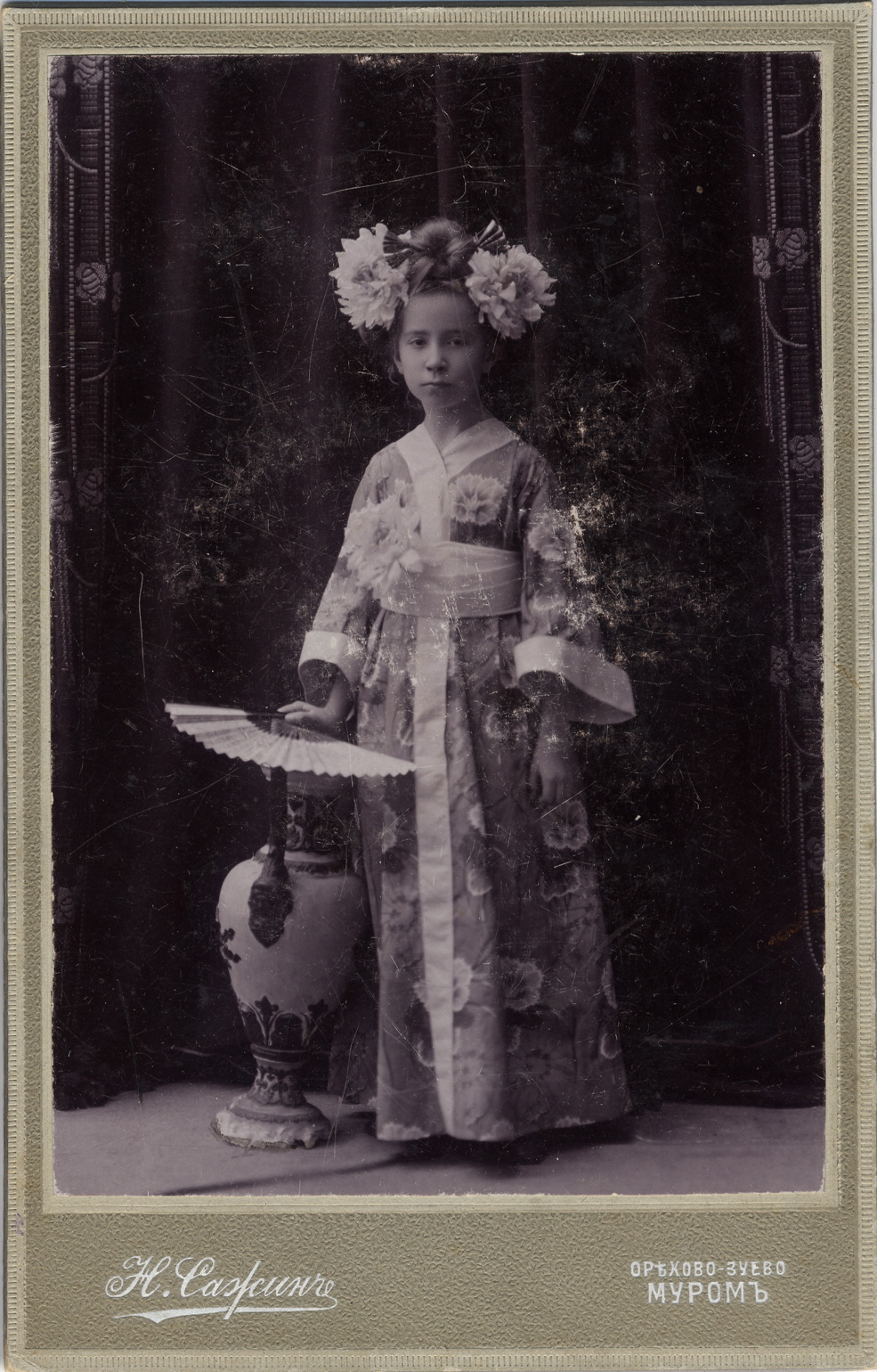 Фото Н.Н. Сажина, Муром. Портрет девочки в японском костюме. 1900-1905. На паспарту:16,7х10,7 Муромский историко-художественный музей