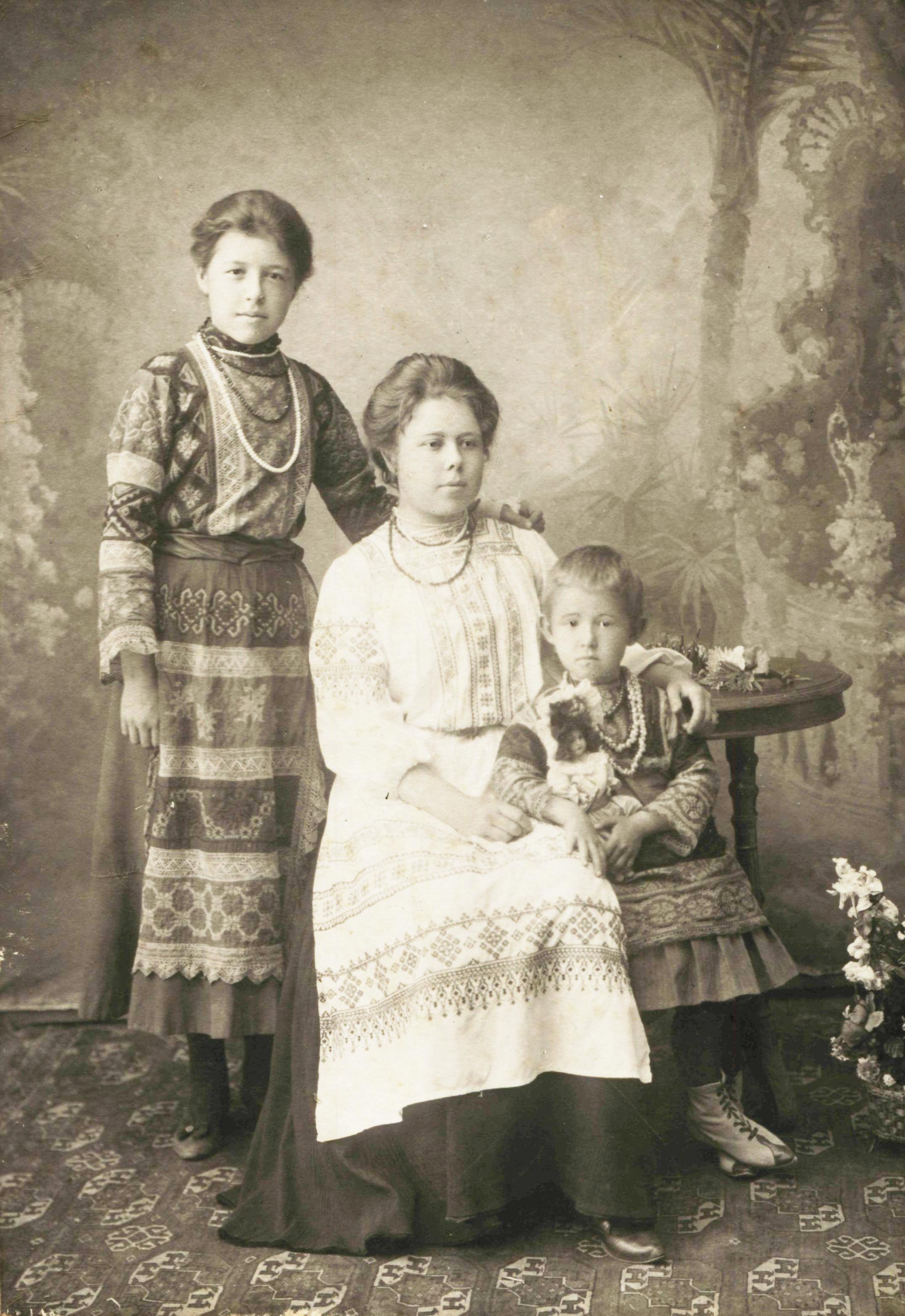 Фотоателье Н. Сажина в Муроме. Елизавета и Мария Орловы с маленькой Софьей Сокольской в русских костюмах. 1906. Частное собрание (архив Дюминых).