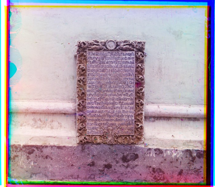 [1910]. Преображенский собор. Доска с надписью на наружной стене собора, где покоились мощи св. кн. Михаила Тверского. Дата на доске: 1718.