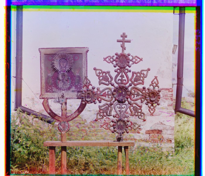 Олонецкая губерния, Лодейнопольский уезд, с. Пидьма. Запрестольный крест и икона в церкви Преображения.