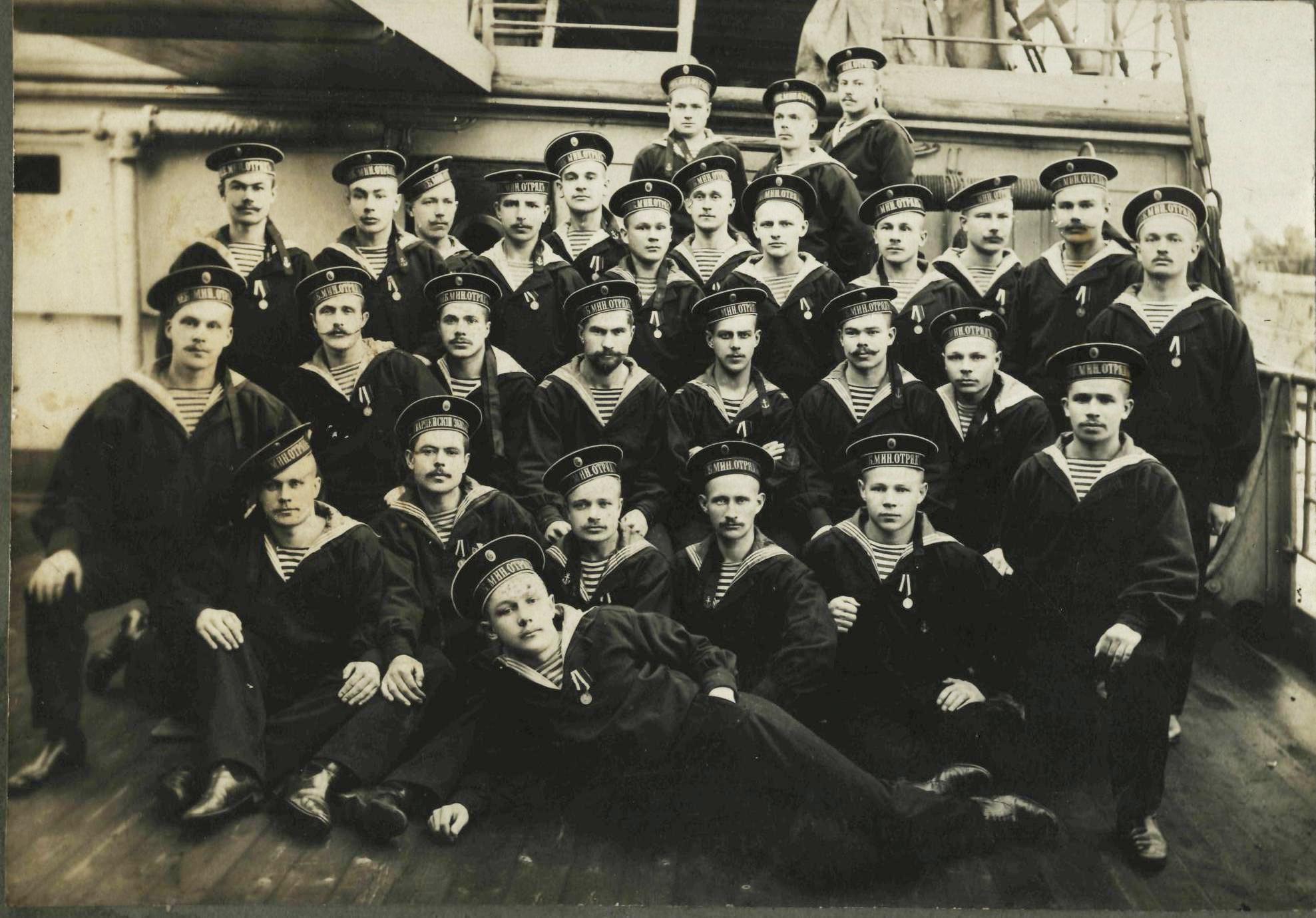 Моряки учебного судна «Николаев». (Михайлов А.Д. в третьем ряду пятый справа). Кронштадт. 1913 г. 9 х 12. Архив Антоновых