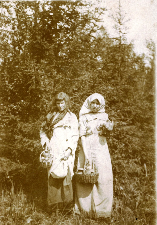 Две девушки на опушке леса с корзинами грибов. Справа -учительница сельской школы Глафира Степановна Тюрникова. Меленковский уезд, 1910-е гг.