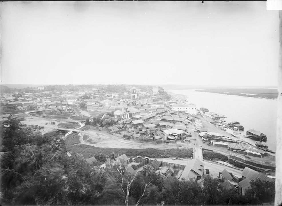 Общий вид села Павлово и рейда реки Оки.Дата: 1891-1982 гг. Автор: М.П. Дмитриев Место съемки: с. Павлово, Горбатовский уезд
