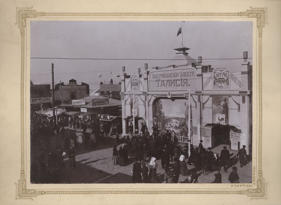 Нижегородская Ярмарка. Часть Самокатной площади. Американский Электрический театр «Талисия».Дата: к. XIX в. Место съемки: г. Н.Новгород Автор: М.П. Дмитриев