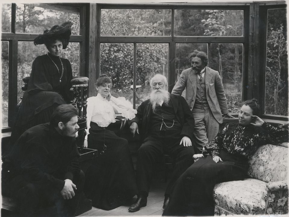 А.М. Горький, М.Ф. Андреева, Л. Яковлева (секретарь Стасова), В.В. Стасов, И.Е. Репин и Н.Б. Нордман-Северова в «Пенатах» Дата: 1904 г. Место съемки: дача Репина «Пенаты» Автор: М.П. Дмитриев