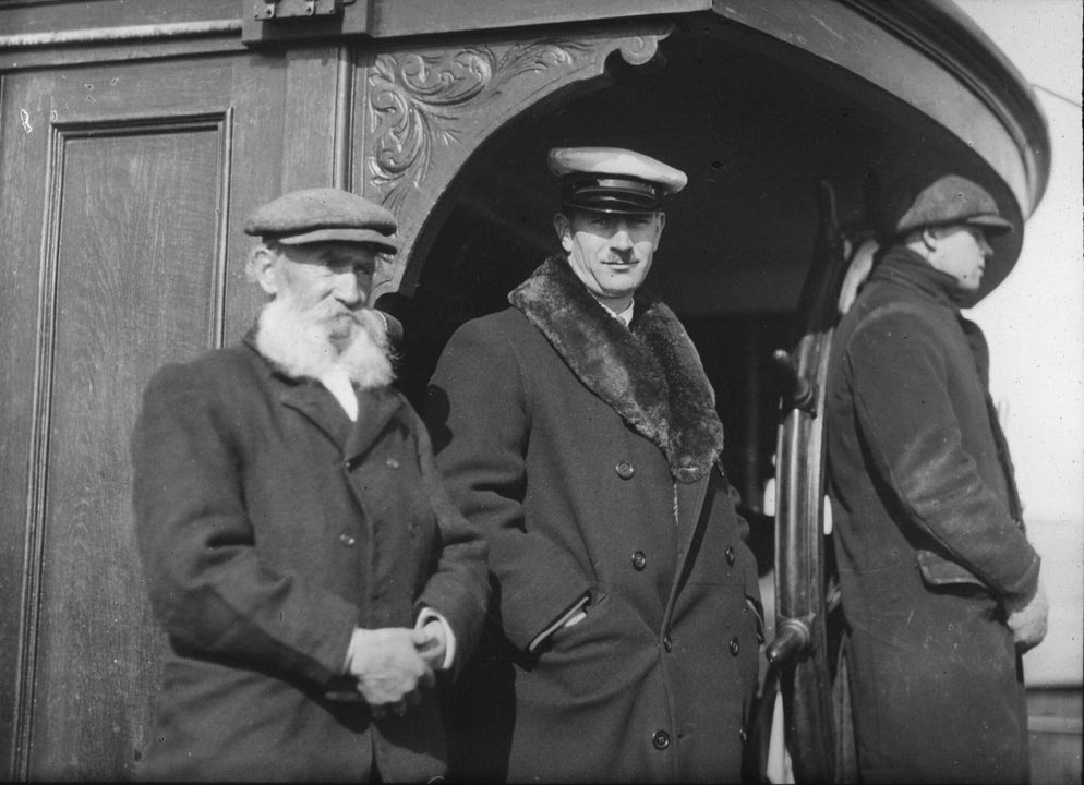 Члены экспедиции. Слева направо: неизвестный мужчина, Иоганн Иогансен Лид и штурвальный. Место события: Северный Ледовитый океан. 18 – 23 августа 1914 г.